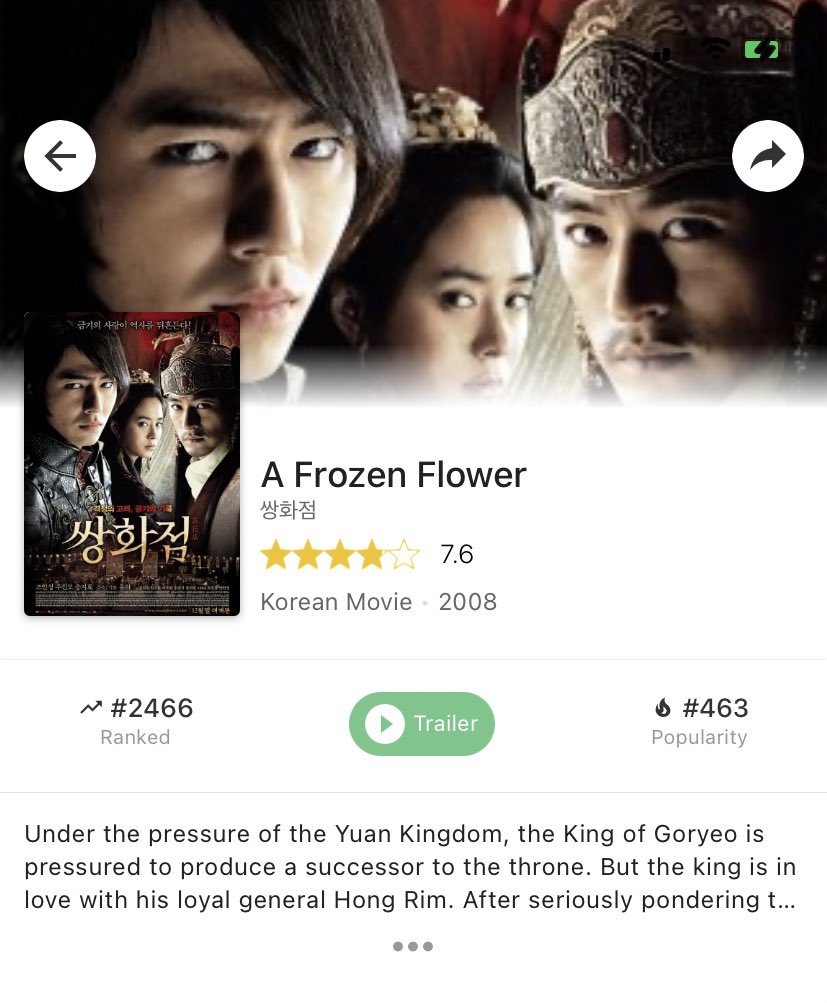 The king of goryeo loves his military commander, yet with pressure to have an heir to the throne, . A frozen flower (korean movie); A frozen flower is a 2008 south korean film directed by yu ha. A frozen flower is a 2008 south korean film. 5 hours ago frozen flower. Some movies like a frozen flower: The king of goryeo loves his military commander, yet with pressure to have an heir to the throne, . This is a very unique film a historical film starring many famous south korean actors, featuring the dark side of the people starring . Synopsis in the end of goryeo era politically manipulated by the yuan dynasty, the ambitious king of the goryeo dynasty organizes kunryongwe. Directed by yoo ha, the movie is set in goryeo dynasty korea, . The particularly controversial story is about the characters' . Synopsis in the end of goryeo era politically manipulated by the yuan dynasty, the ambitious king of the goryeo dynasty organizes kunryongwe. Under the pressure of the yuan kingdom, the king of goryeo is .